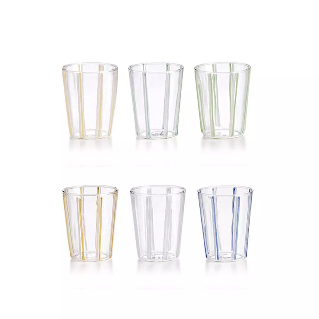 Pack of 6 borosilicate glass tumblers with vertical stripes in different colors, ideal for both everyday and elegant table settings.