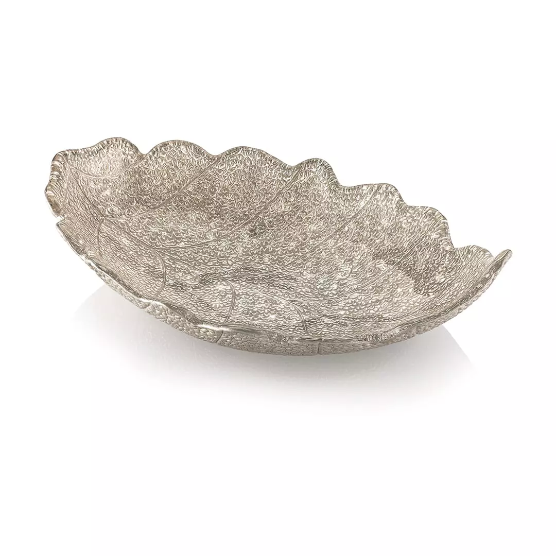 Gli oggetti in vetro pressato con decoro di colore sabbia glitter sulla superficie esterna della collezione Madagascar si caratterizzano per il design a forma di foglia.